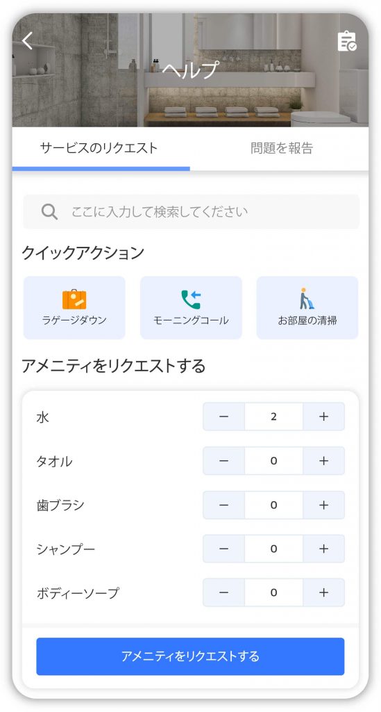 고객은 어메니티를 선택한 후 모바일 기기로 주문합니다